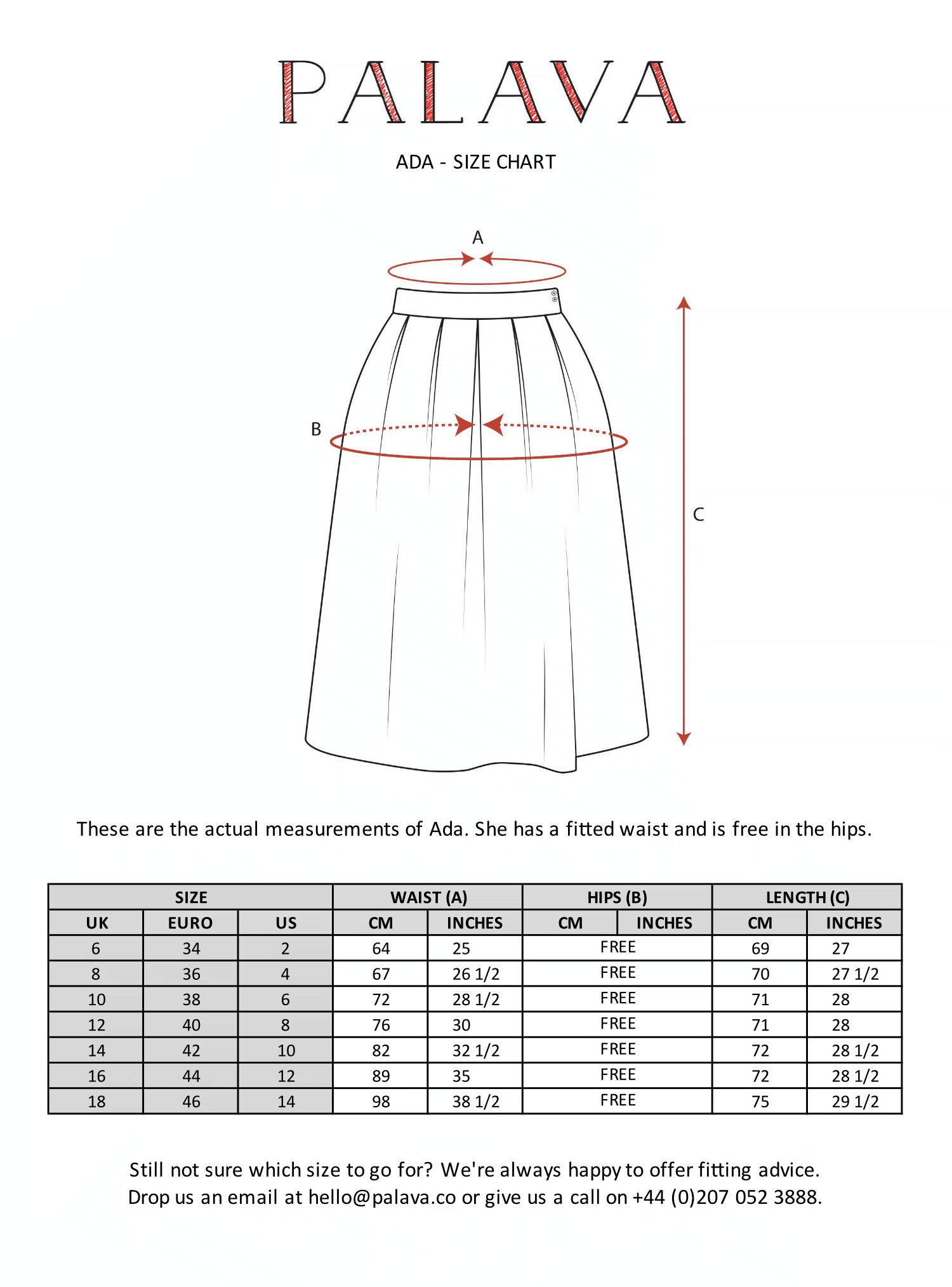 About the Style: Pretty Ada has been a favourite style at Palava for many years. A timeless shape - she looks as much at home today as she would have done in the 1950s. Deep pleats at the waist add volume to her skirt, her flattering length makes her easy to dress up or down and, of course, she has the characteristic, deep Palava pockets.