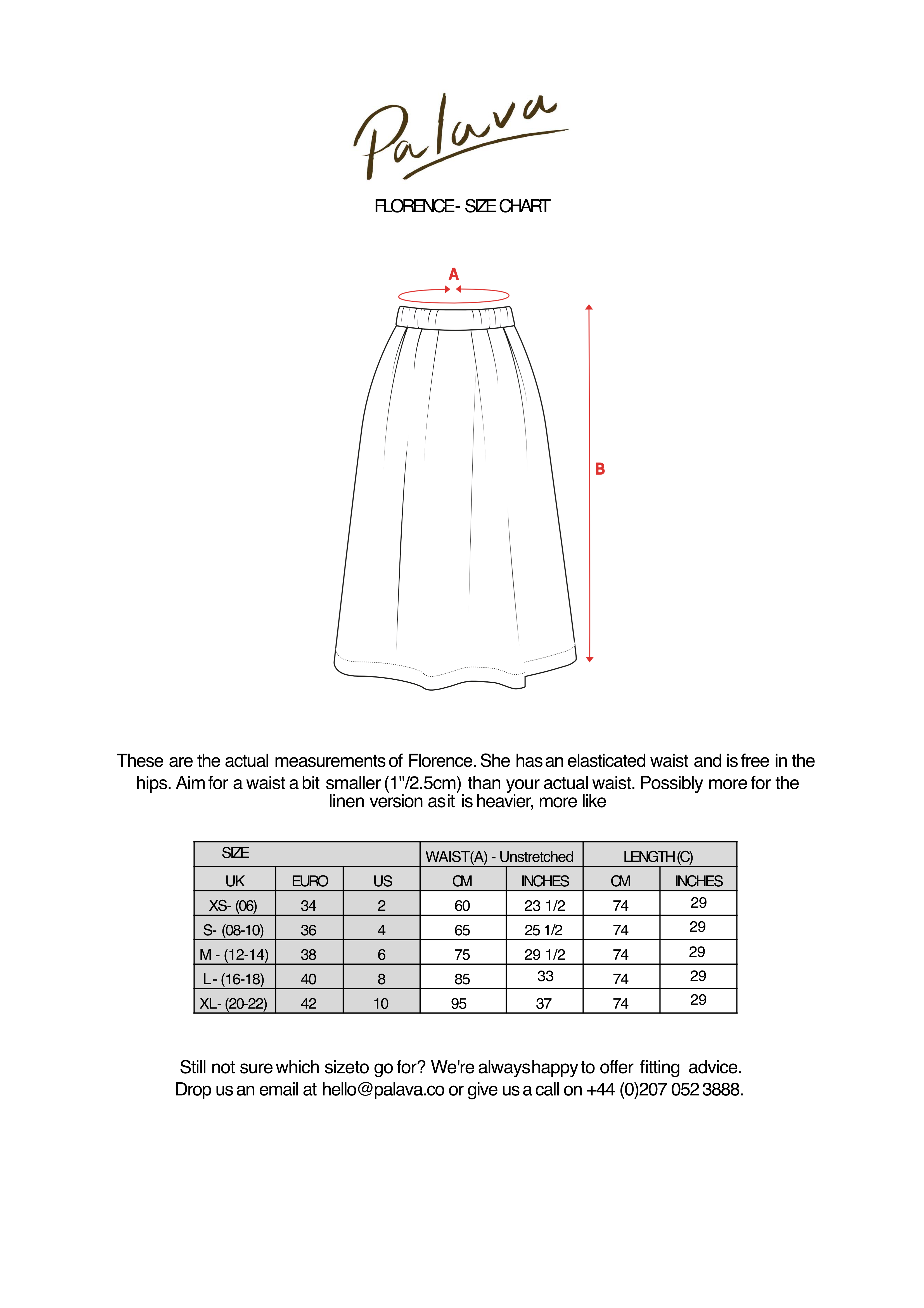 About the Style: Our new skirt was a standout success in SS25, and this season we’ve made a few thoughtful tweaks. We’ve reduced some fabric at the waist for a more comfortable fit and a smoother silhouette. Of course, the signature Palava pockets remain, along with the stylish yet comfortable elasticated waist, making this skirt as practical as it is elegant.