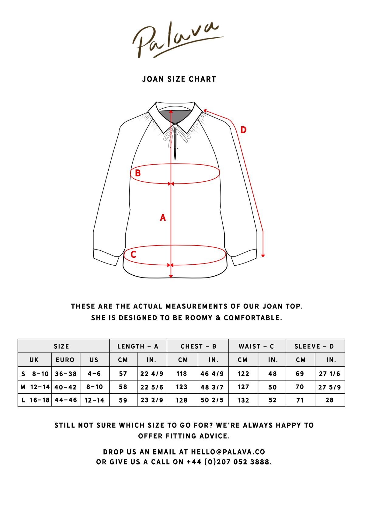 Sizing: Annie is 5'6" and is wearing a size Small. Our Joan top is quite a relaxed fit. For more information on size and fit see the Size Guide to the right of sizes available below.